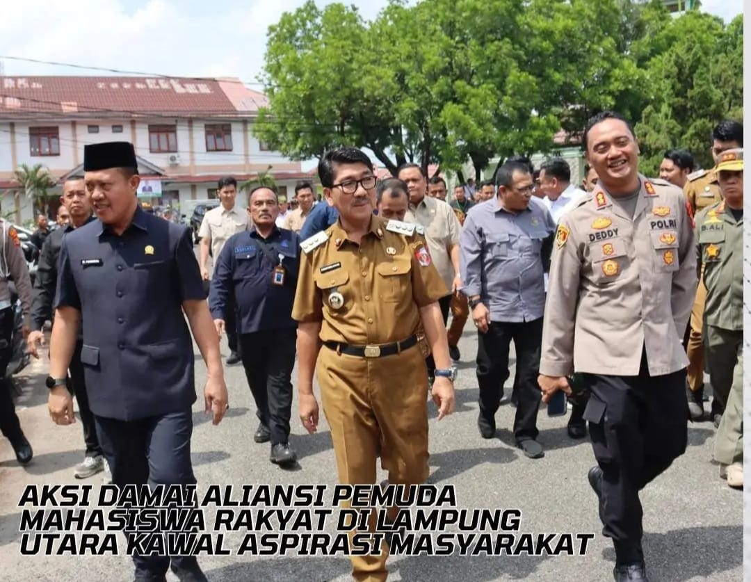 Bupati Lampung Utara, Dr. Ir. Hamartoni Ahadis, M.Si., bersama jajaran Forum Komunikasi Pimpinan Daerah (Forkopimda Plus) menerima langsung aksi damai yang digelar oleh Aliansi Pemuda, Mahasiswa, dan Rakyat Lampung Utara di Halaman Pemda setempat.